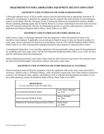 Equipment or furniture. EHS and/or Biosafety provide the minimum requirements for decontamination with which equipment owners must comply. For more information on these decontamination requirements, refer to the EHS Decontamination of Laboratory Equipment Resources as published on the EHS website, or contact EHS. ... Read Content